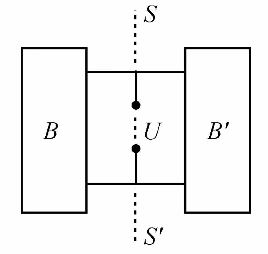 所用的直切面,即该电路的传递对称面,如右图中的 $SS'$ 平面。传递对称面可能不止一个。与传递对称面对称的点称为传递对称点。如在端口处加上电压,每一对传递对称点的电势都是相等的。
