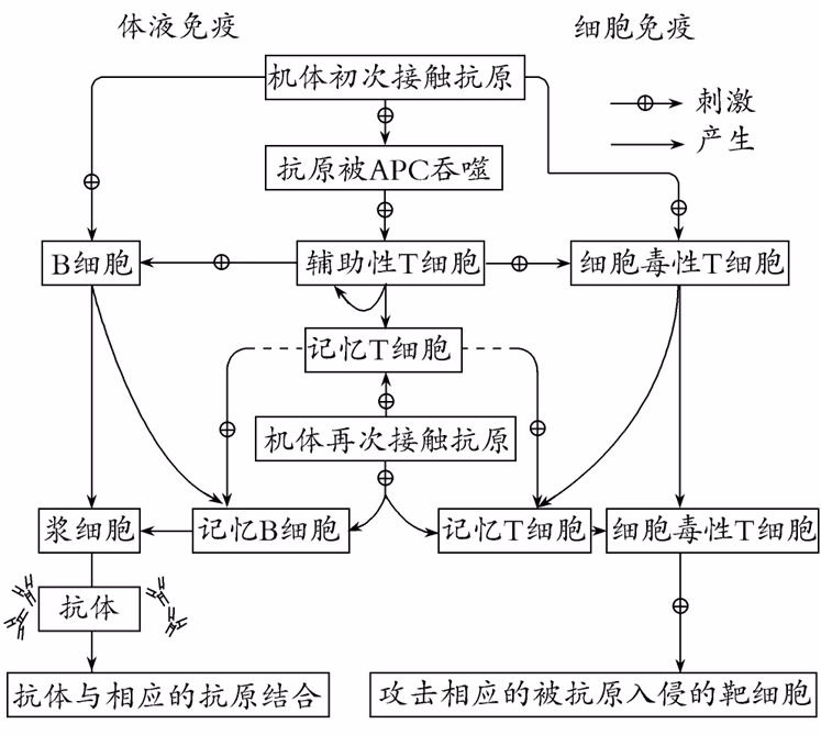 能增殖、分化的免疫细胞:B 细胞(浆细胞除外)、T 细胞(主要考察辅助性 T 细胞、细胞毒性 T 细胞),重点考察记忆细胞。