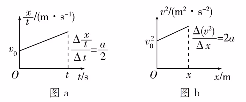特殊图像 $v^2-x$ 图像:由 $v^2-v_0^2=2ax$ 可得 $v^2=v_0^2+2ax$,图线斜率为 $2a$,图像纵截距为初速度的二次方,如图 b。