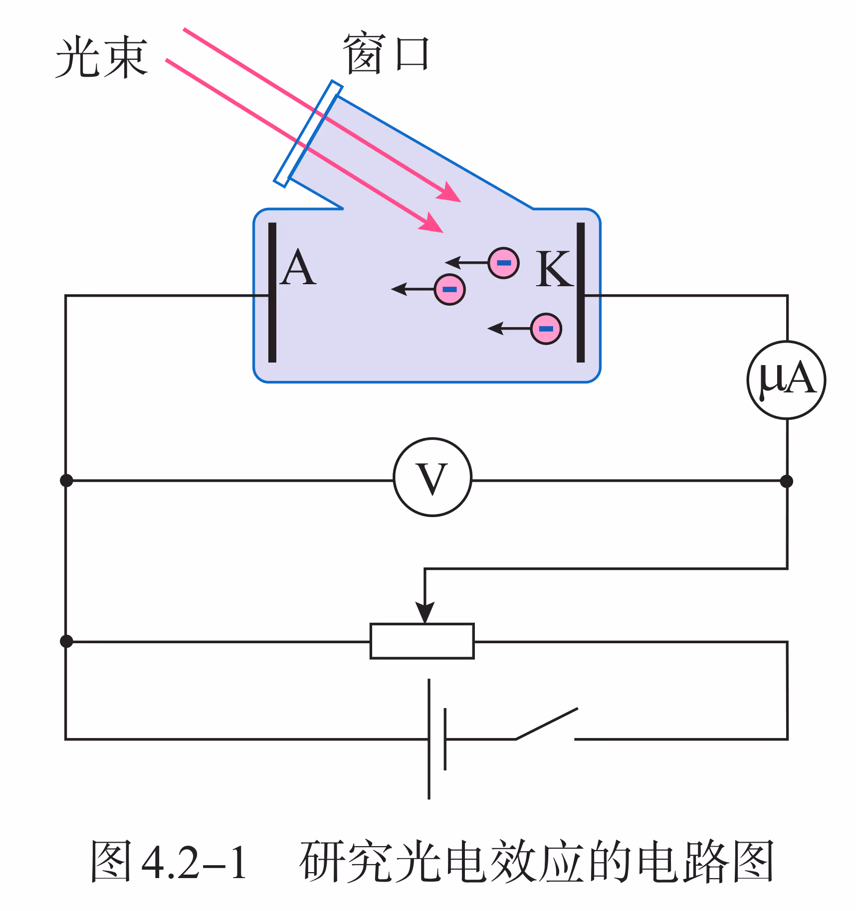 阴极 K 和阳极 A 是密封在真空玻璃管中的两个电极,阴极 K 在受到光照时能够发射光电子,在两极板电压 $U$ 产生的电场的作用下,向左移动。