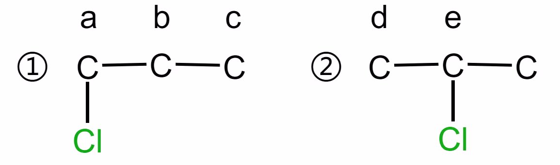 - 其中,在 ① 的 $b$ 位置取代与在 ② 的 $d$ 位置取代后得到的产物(1,2-二氯丙烷)重复。