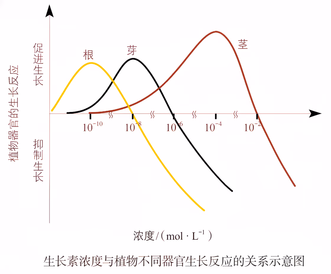 研究发现,生长素所发挥的作用,因浓度、植物细胞的成熟情况和器官的种类不同而有较大的差异。一般情况下,生长素在浓度较低时促进生长,在浓度过高时则会抑制生长(低促高抑)。重点:主要是受体决定响应,而不仅仅是浓度。同一激素,不同细胞反应不同,取决于受体类型、受体数量、信号通路差异。